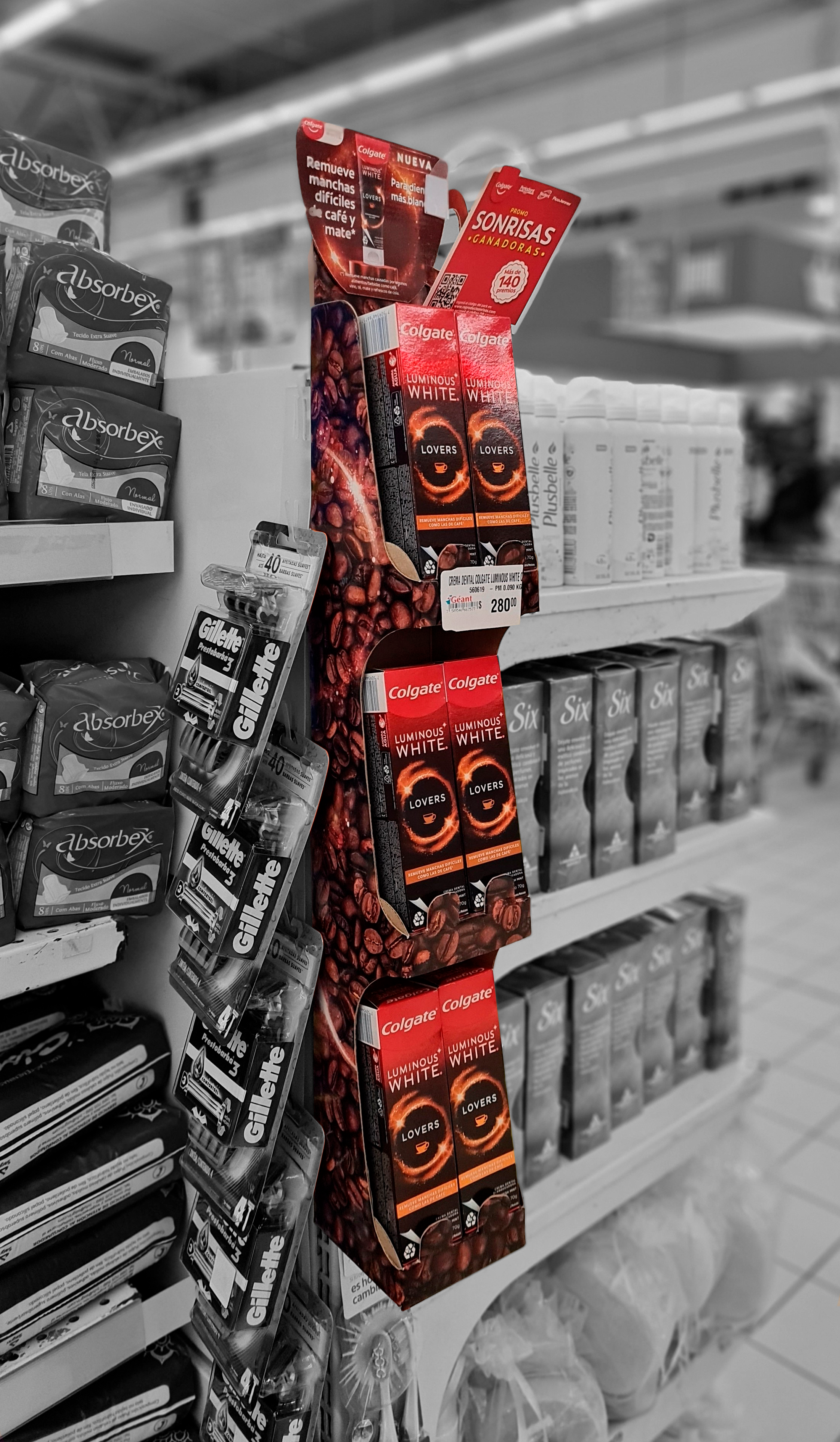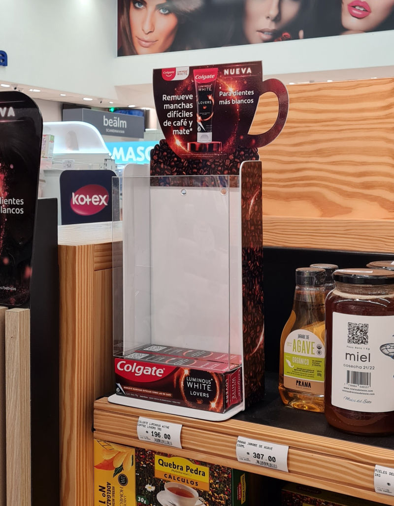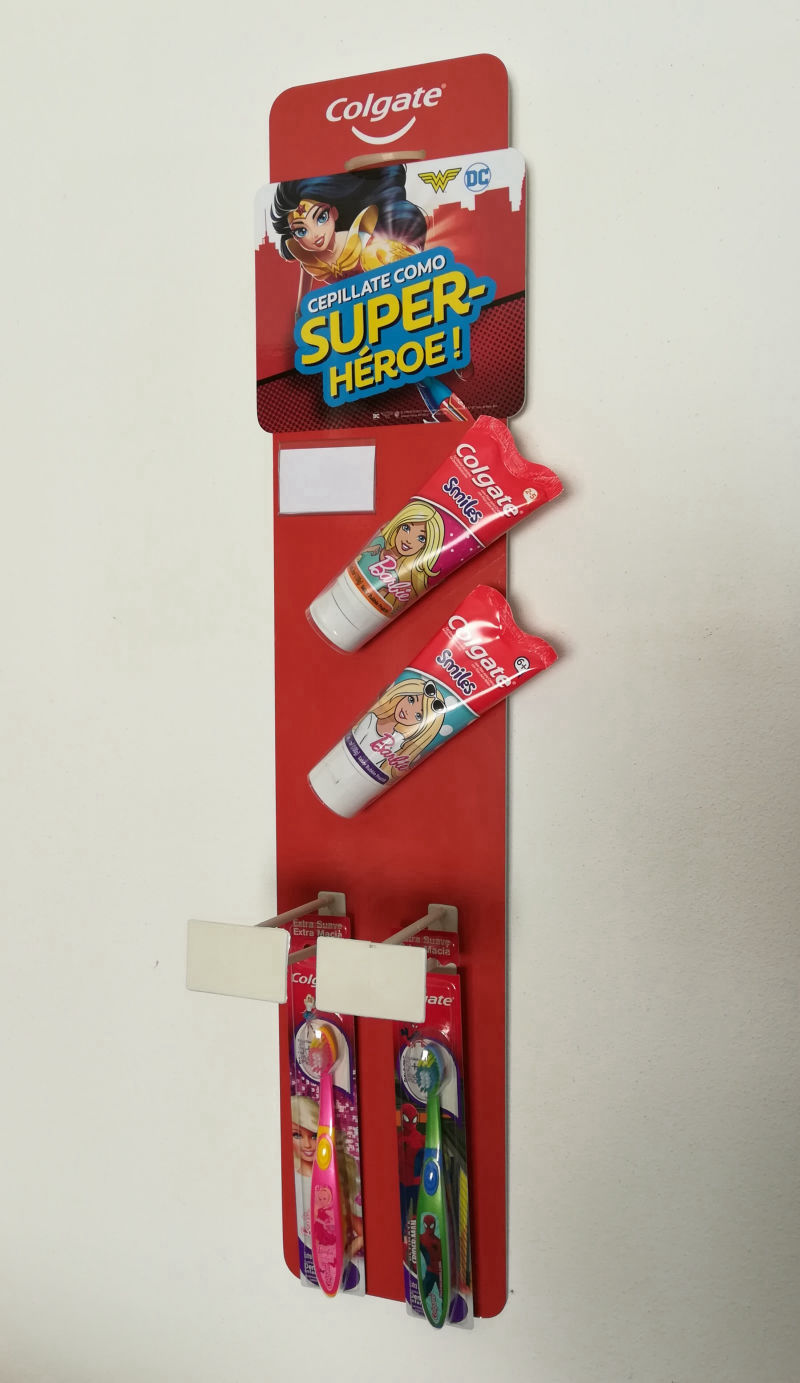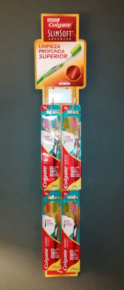 Tira impulso enjuagues COLGATE PLAX con soportes troquelados.