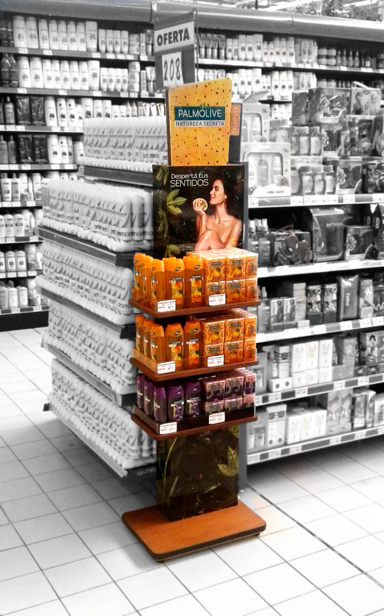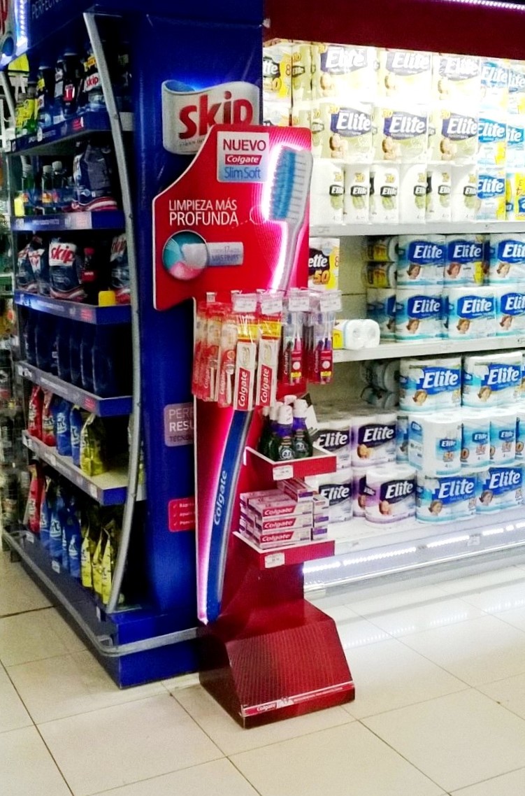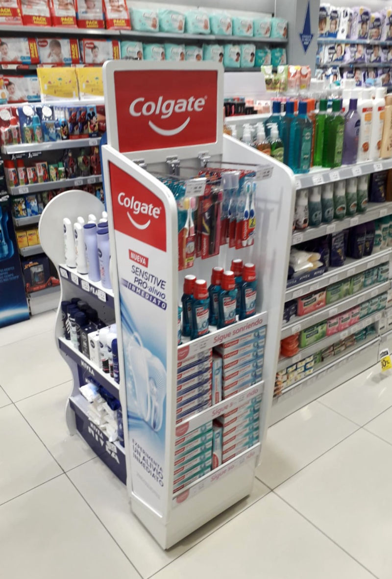 Exhibidores COLGATE - PALMOLIVE de MDF laqueado con gráficas intercambiables.