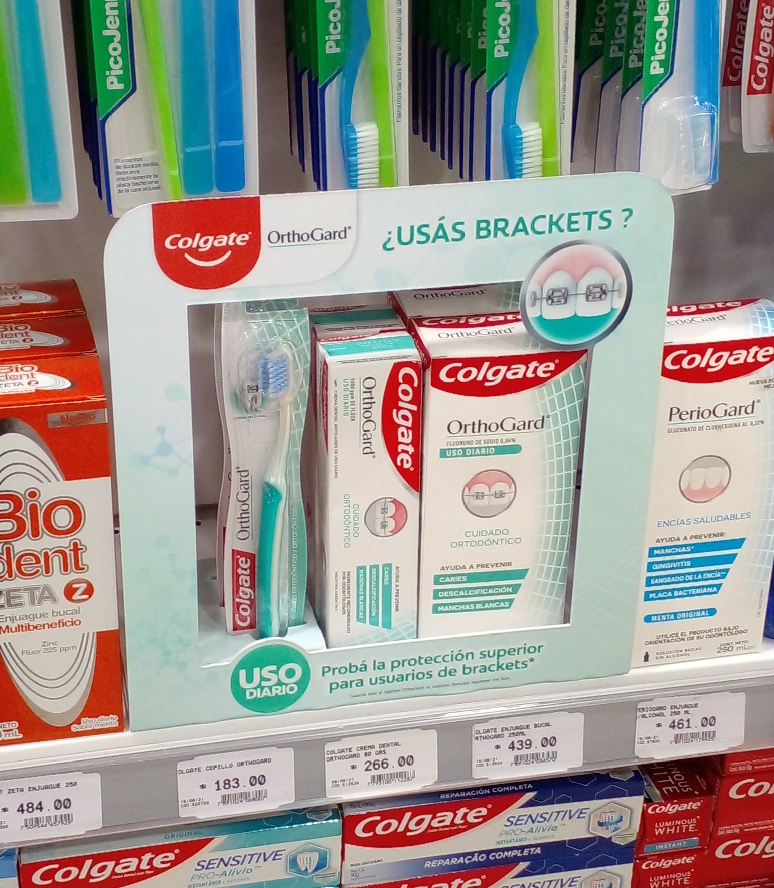 Marco COLGATE ORTHOGARD con soporte para productos.